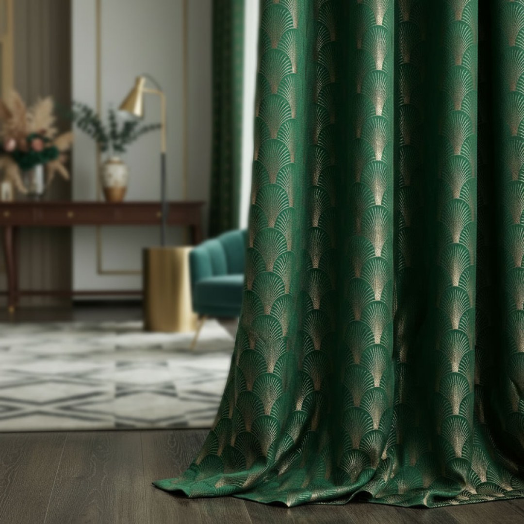 The Roaring Twenties Luxury Art Deco Shell Patterned Dark Green & Gold Curtain