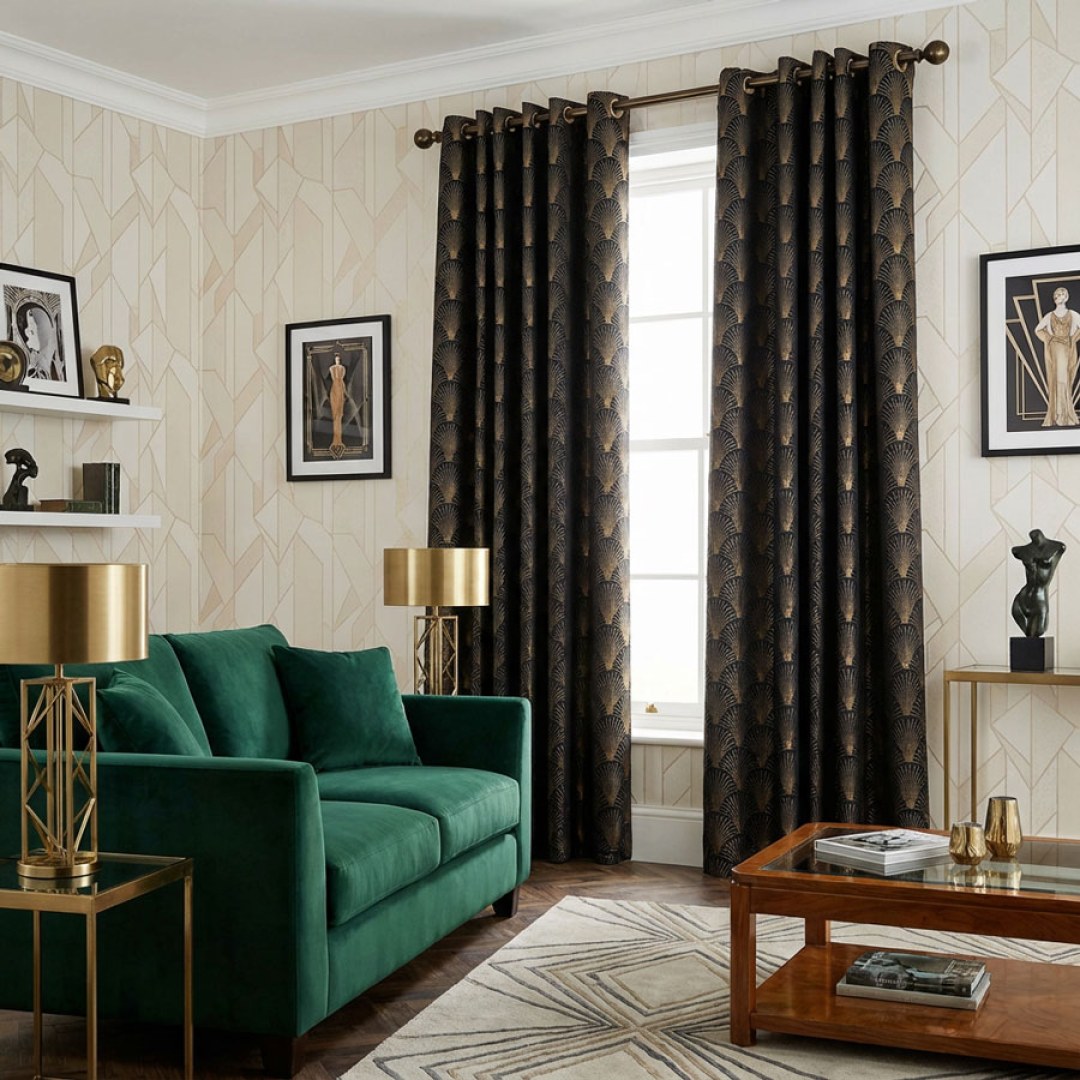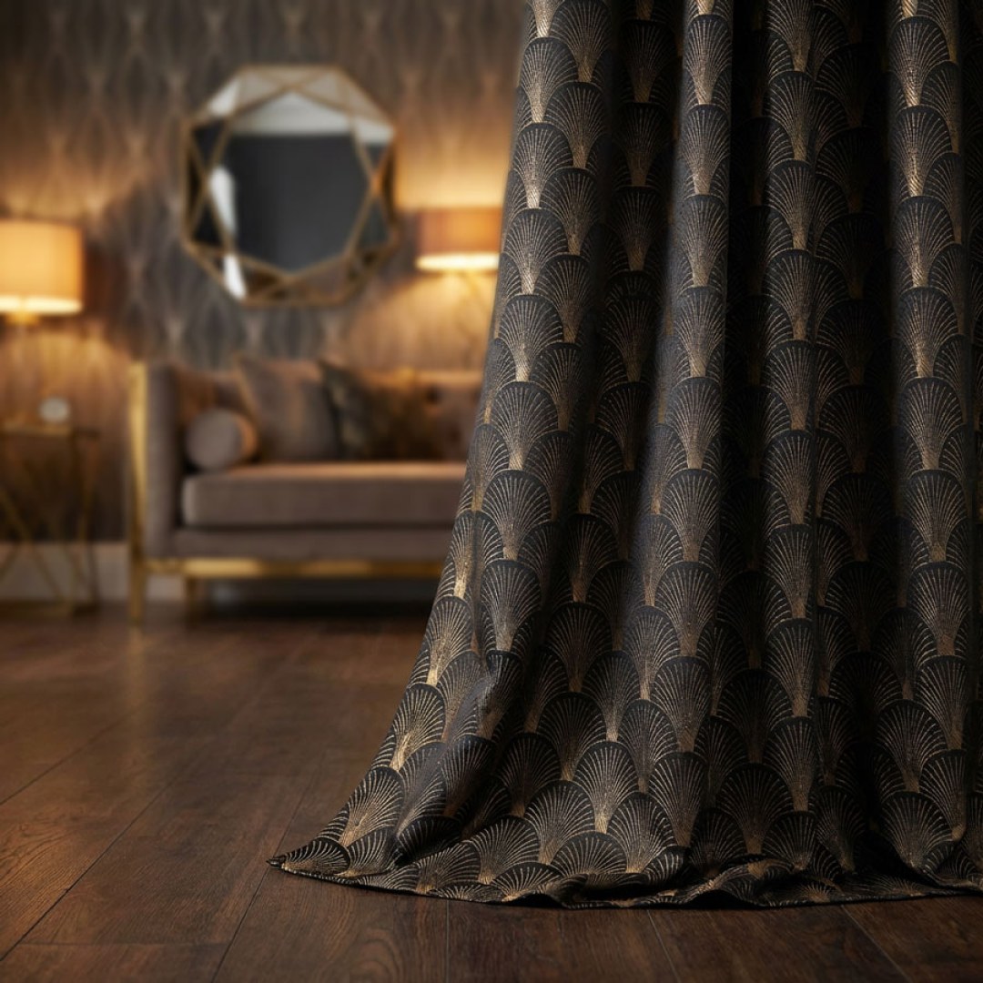 The Roaring Twenties Luxury Art Deco Shell Patterned Black & Gold Curtain