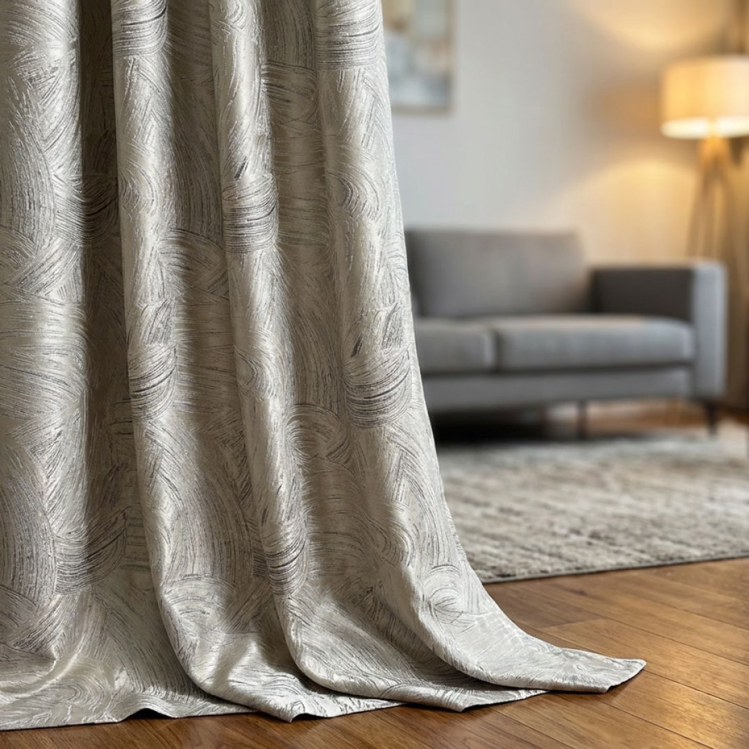 Featuring painterly brushstroke patterns in elegant champagne taupe, these jacquard curtains offer a subtle metallic sheen that adds depth and sophistication. Their contemporary artistic design brings texture and understated luxury to any room.