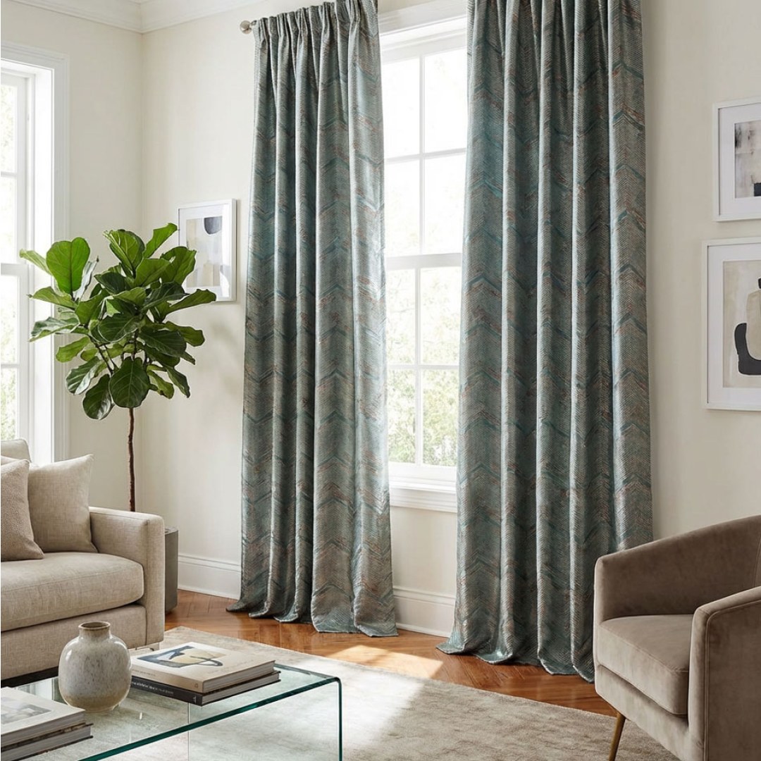 These curtains feature a bold geometric chevron pattern on luxurious faux silk with a subtle sheen. Perfect for contemporary interiors, their timeless design adds depth and sophistication to any space.