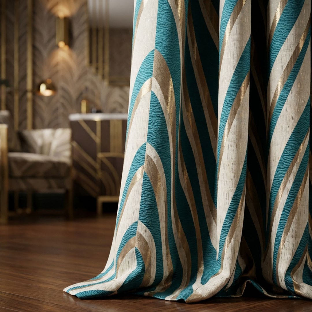 Ocean Wave Elegance Teal and Gold Art Deco Geometric Curtains