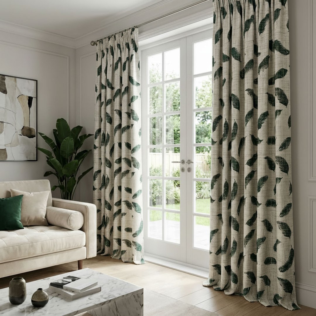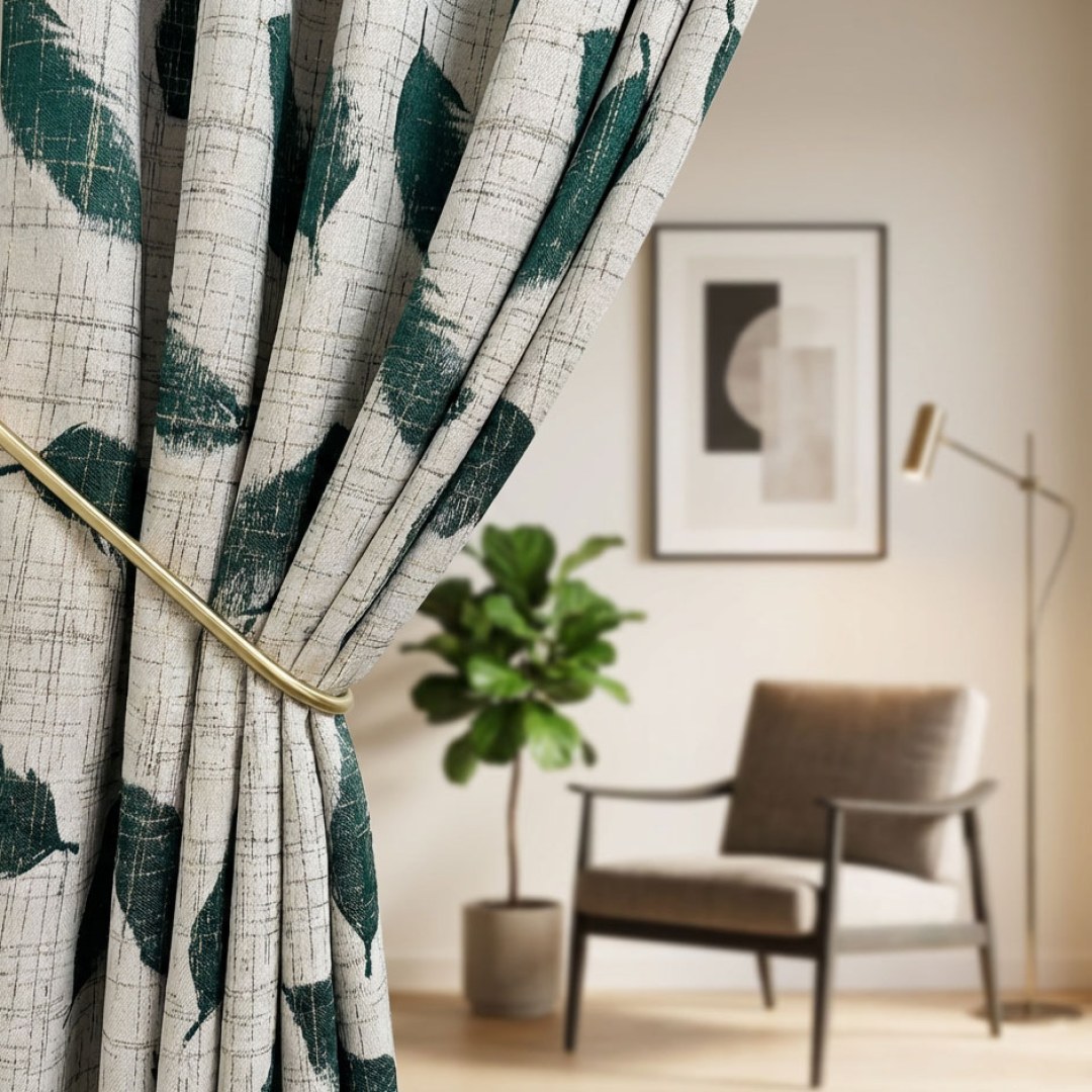 Featuring an intricate feather motifs accented by subtle cross-hatch lines, this luxurious curtain blends abstraction with artistry. The flowing, organic motifs deliver a modern yet elegant aesthetic, making it an ideal choice to elevate contemporary interiors in need of refined visual interest.