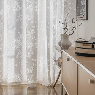 Enchanted Garden Rose & Butterfly Floral Ivory White Voile Curtain