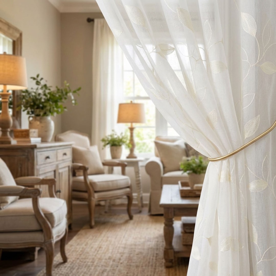 Embroidered with a delicate leaf motif, this ivory voile curtain adds soft texture and elegance. Its airy fabric and refined design blend traditional charm with contemporary versatility, enhancing a variety of interiors.