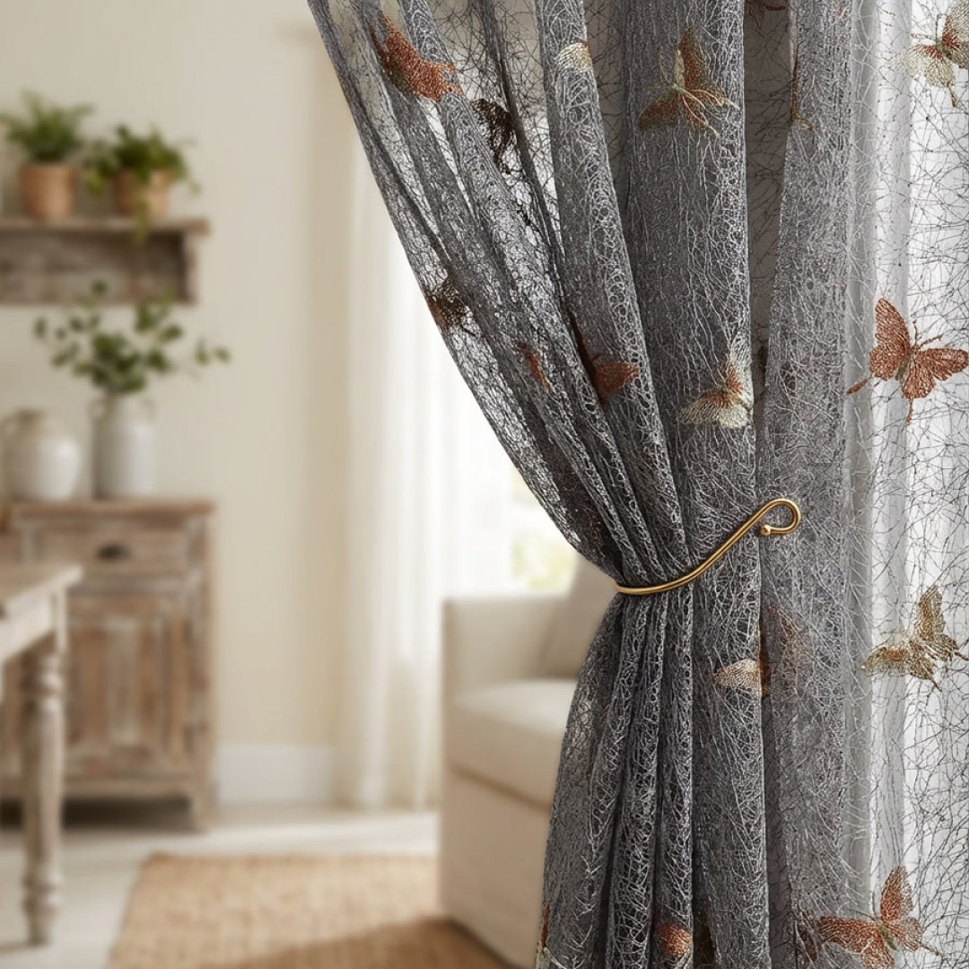 A contemporary mesh net curtain fabric featuring delicately embroidered butterflies with touches of gold glitter. The airy weave and shimmering details bring a whimsical yet elegant charm, perfect for adding light, texture, and a hint of sparkle to modern interiors.