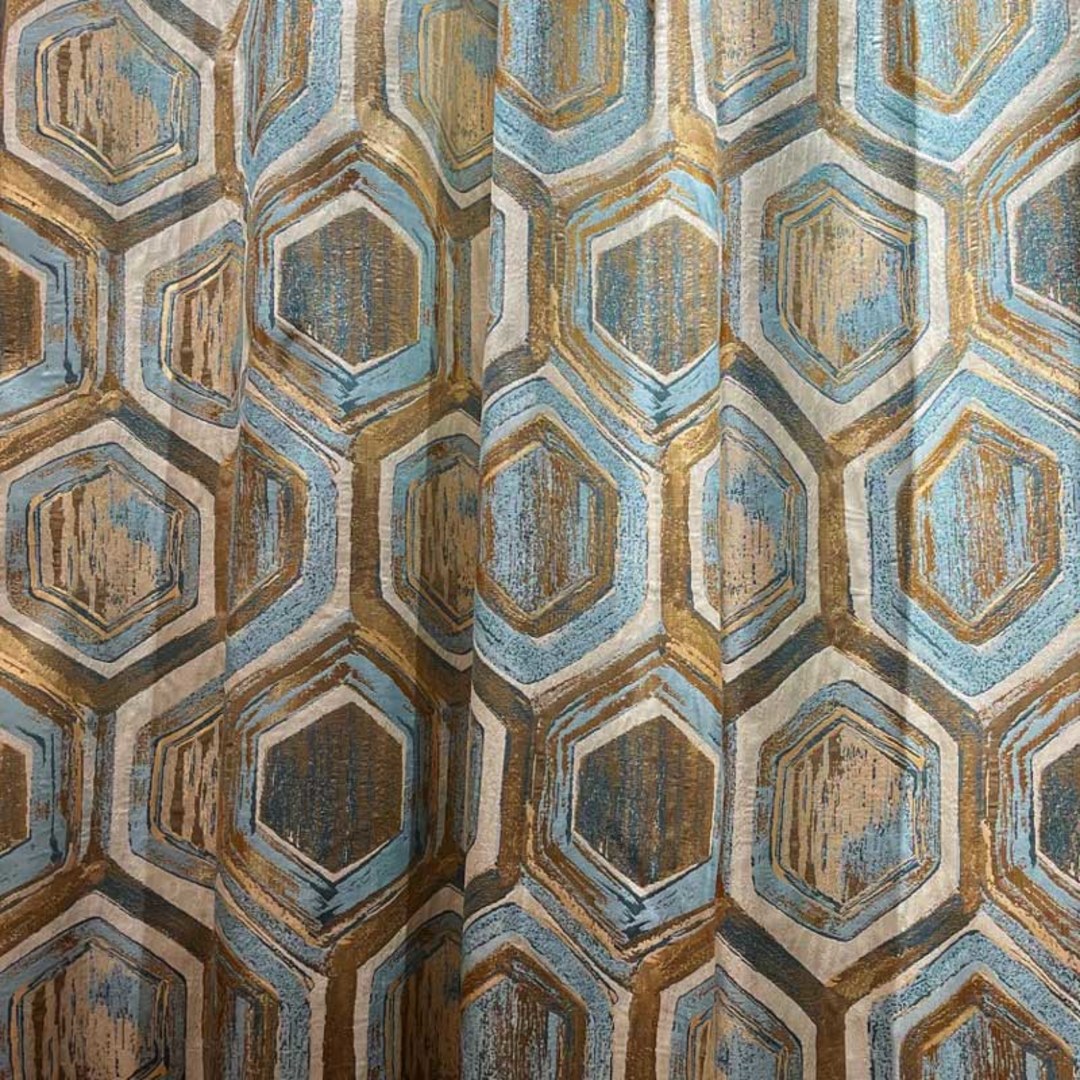 Obtenez un nouveau look sophistiqué avec ces luxueux rideaux jacquard à motifs géométriques en turquoise et or métallique. Ce design moderne complétera n'importe quelle pièce de votre choix et constituera un élément décoratif audacieux.
