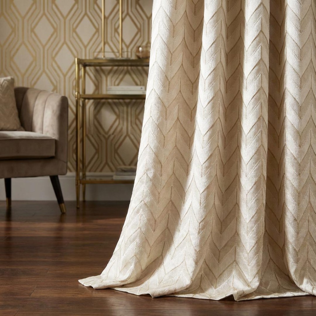 Élégant rideau chevrons Art Déco ivoire avec détails dorés