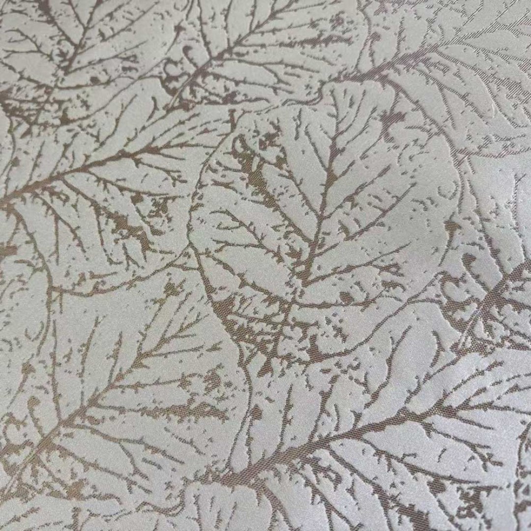 Un élégant rideau d'inspiration naturelle avec des silhouettes de feuilles détaillées dans une teinte sourde et terreuse. De subtils accents métalliques mettent en valeur les délicates nervures des feuilles, ajoutant profondeur et texture.
