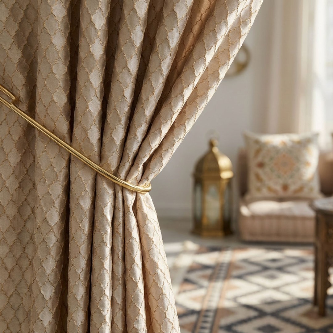 Ce luxueux tissu pour rideaux présente un motif arabe complexe, avec d’élégantes touches dorées tissées dans un design texturé.