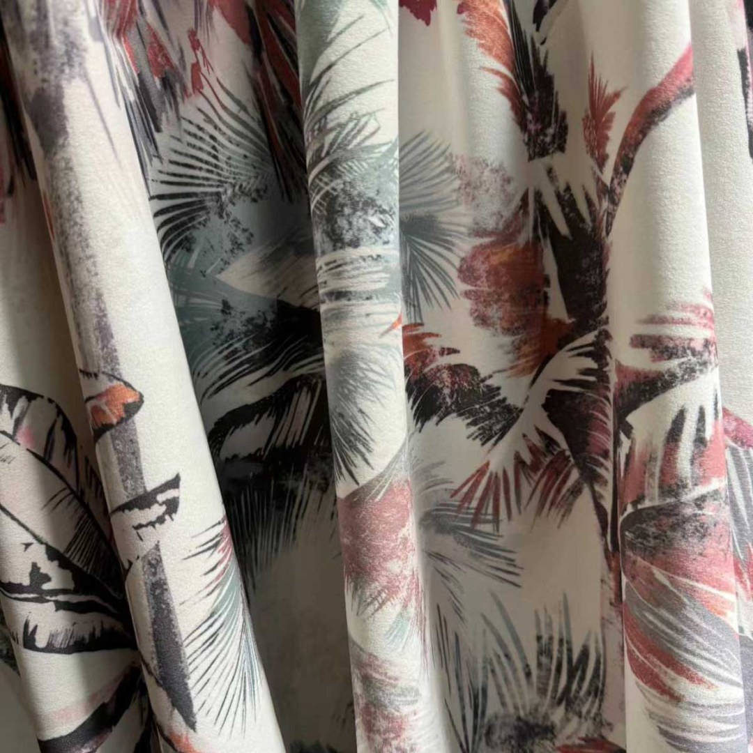 The warm, multicoloured velvet curtain that evokes the tranquil beauty of palm trees silhouetted against a setting sun. The tropical floral pattern adds an exotic flair, creating a modern and serene ambiance in any room