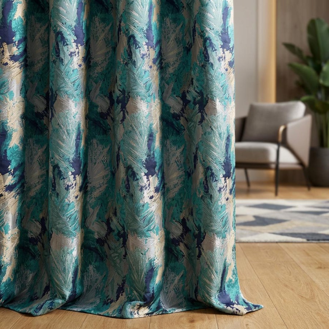 Bring modern sophistication to your space with this contemporary jacquard curtain. The artistic, nature inspired design in rich teal tones is enhanced with subtle metallic highlights, adding depth, shimmer, and elegance, perfect for a bold interior statement.