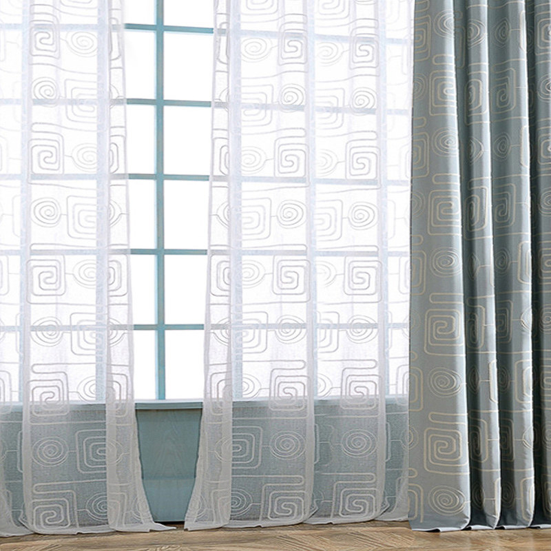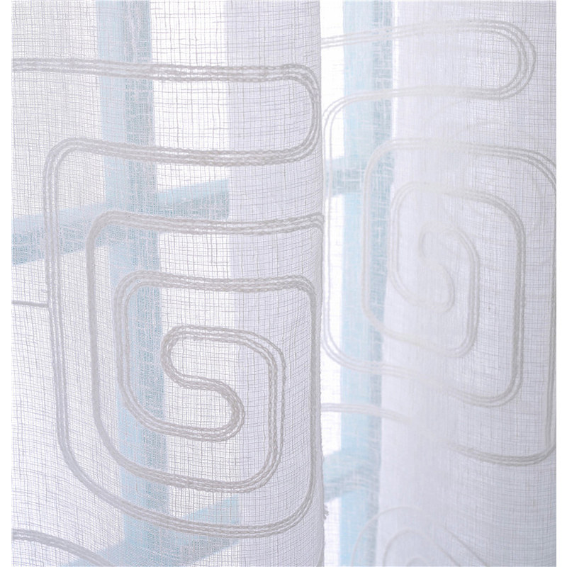This white voile curtain features an embroidered spiral maze design, blending airy cotton texture with modern geometric style. Light and minimal, it offers a clean, contemporary look while softly filtering daylight, perfect for bright and sophisticated interiors.
