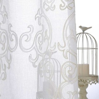 Ivory white voile with elegant damask floral embroidery in soft tones. Light and airy yet refined, this curtain brings timeless traditional sophistication and delicate charm to any room.