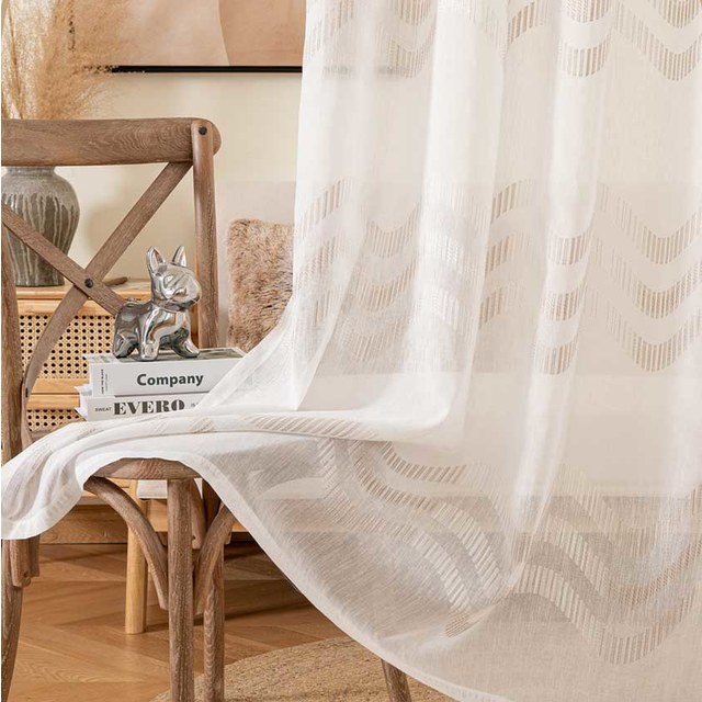 Pared-back living spaces can be calm havens. Try a subtle way to give your home a sophisticated yet minimalist look with these rolling wave patterned white voile curtains.