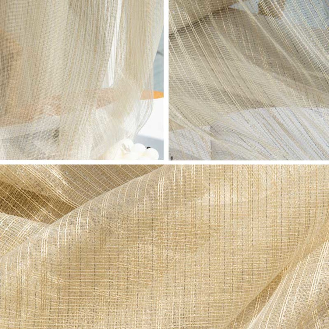 These delicate mesh sheers feature subtle vertical glitter stripes, bringing a refined sparkle to any room. Light and airy, they softly filter sunlight while adding modern elegance and visual interest, making them a versatile choice for a variety of contemporary interiors.