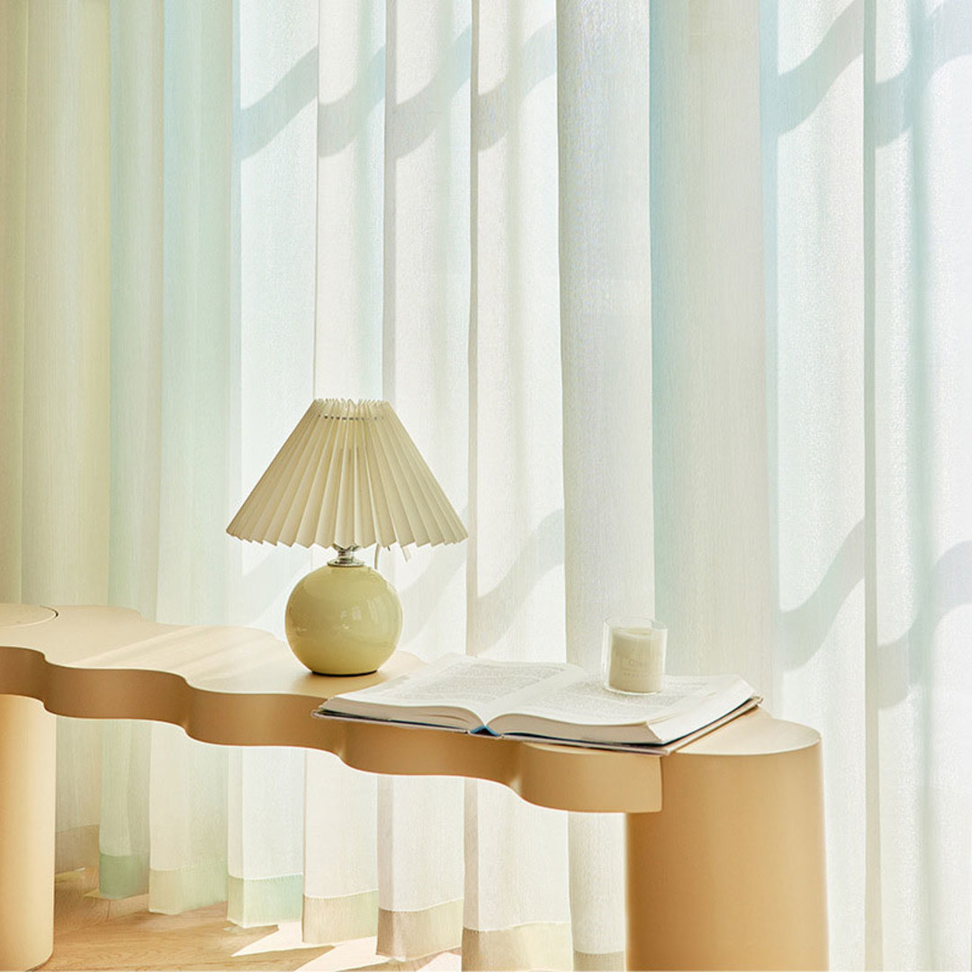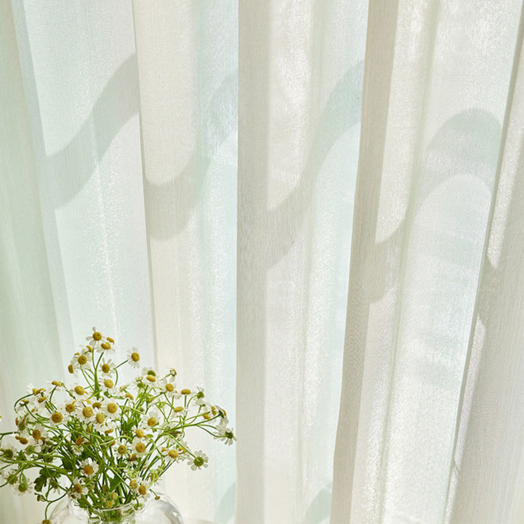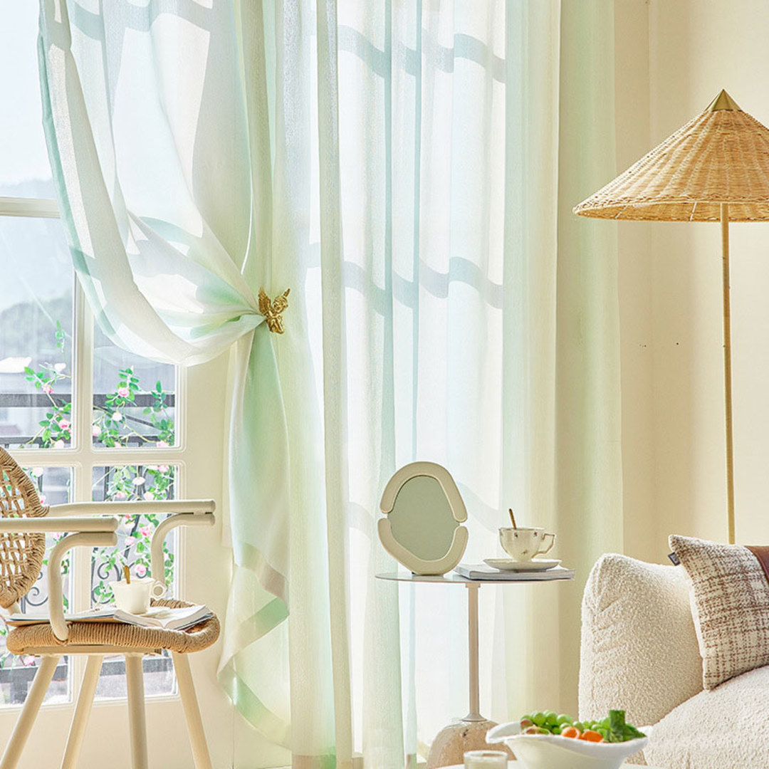 This ombré sheer curtain features a vertical striped organza weave with a subtle shimmer, transitioning gracefully from green to lilac to gold. Its lightweight structure allows soft light to filter through, creating an elegant and airy ambiance.