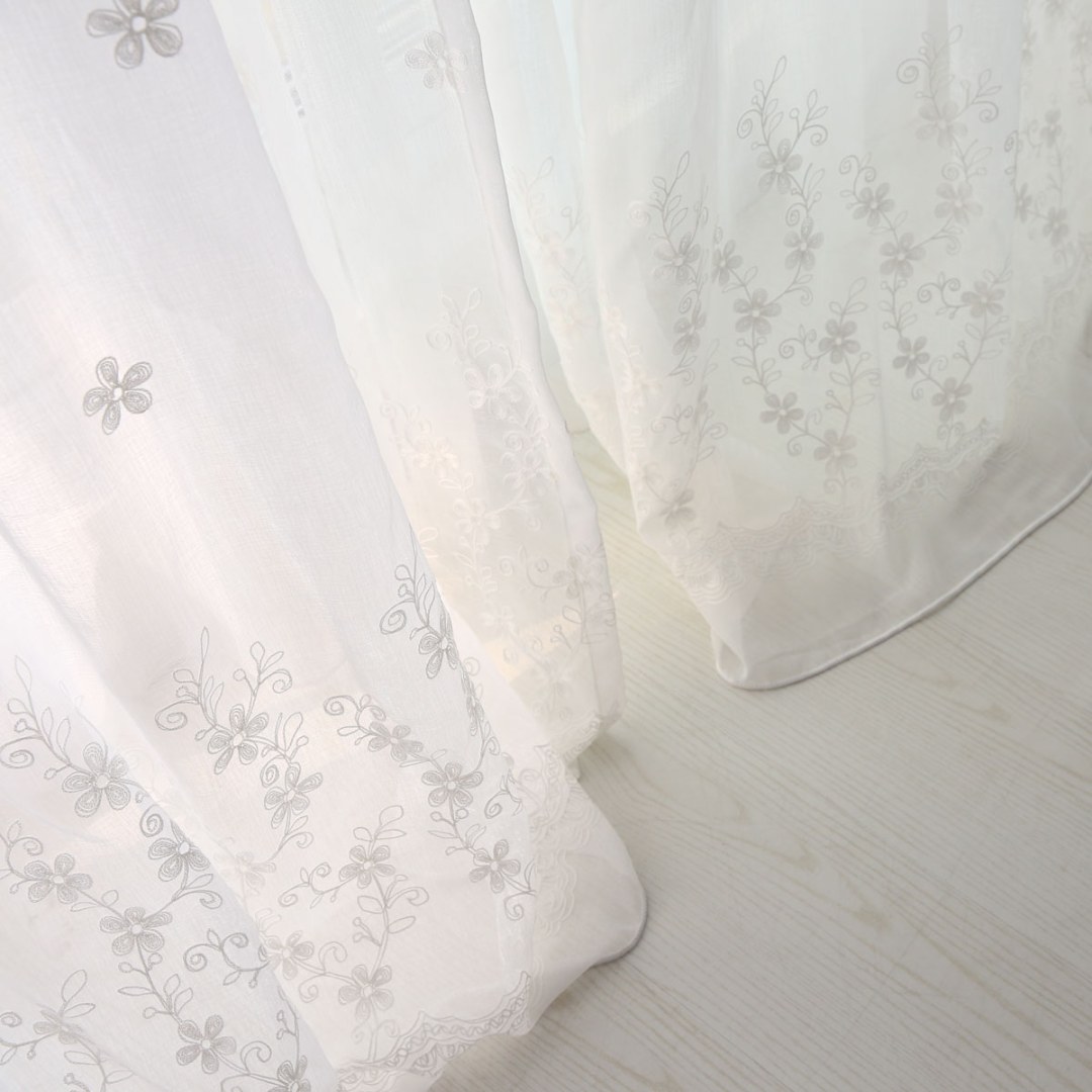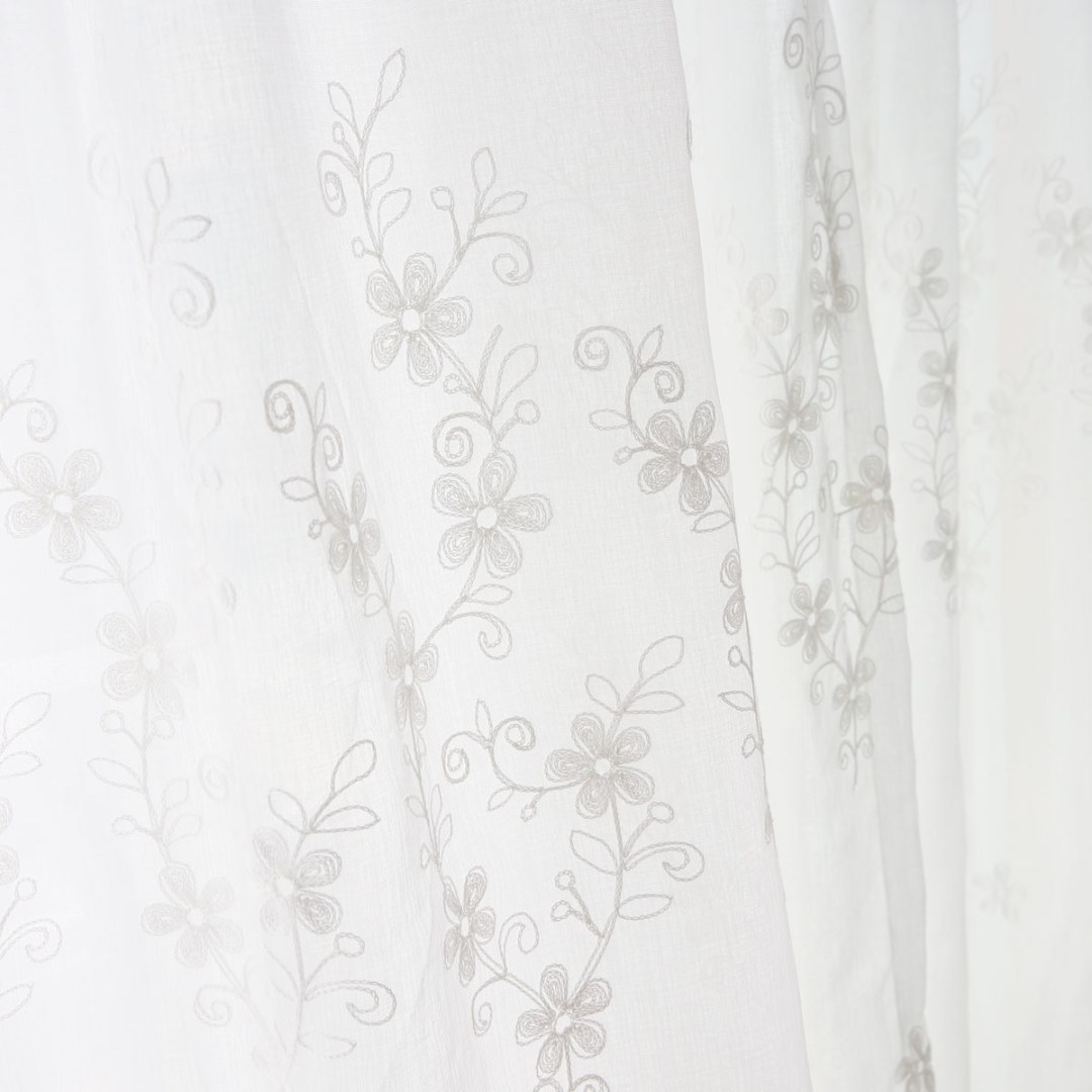Softly embroidered with delicate floral motifs, these sheer curtains add airy elegance and subtle texture. Their muted tones and refined design make them versatile for country, farmhouse, shabby chic, and romantic interiors.