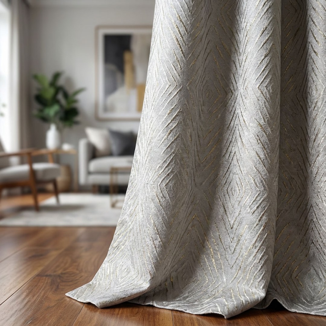 Defined by a striking 3D jaquard diamond motif and shimmering metallic accents, these curtains offer contemporary sophistication with a touch of glamour. They are perfect for adding depth, texture, and a luxurious accent to any space.