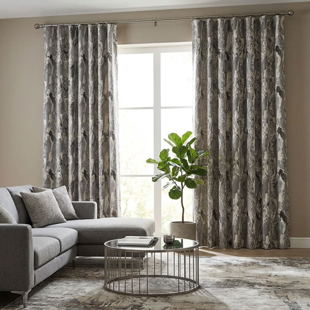 These jacquard curtains feature a bold metallic reptilian pattern that blends contemporary sophistication with exotic allure. The luxurious sheen and intricate design make them perfect for adding dramatic visual interest and a striking statement to any interior.