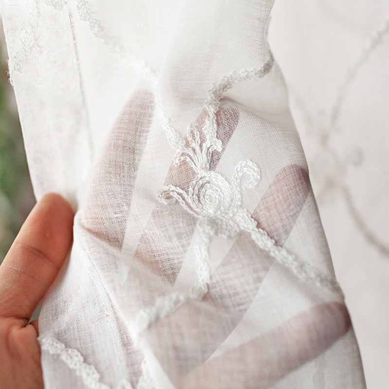 Fleur Arabesque White Sheer Voile Curtains with Embroidered Trellis and Royal Detailing