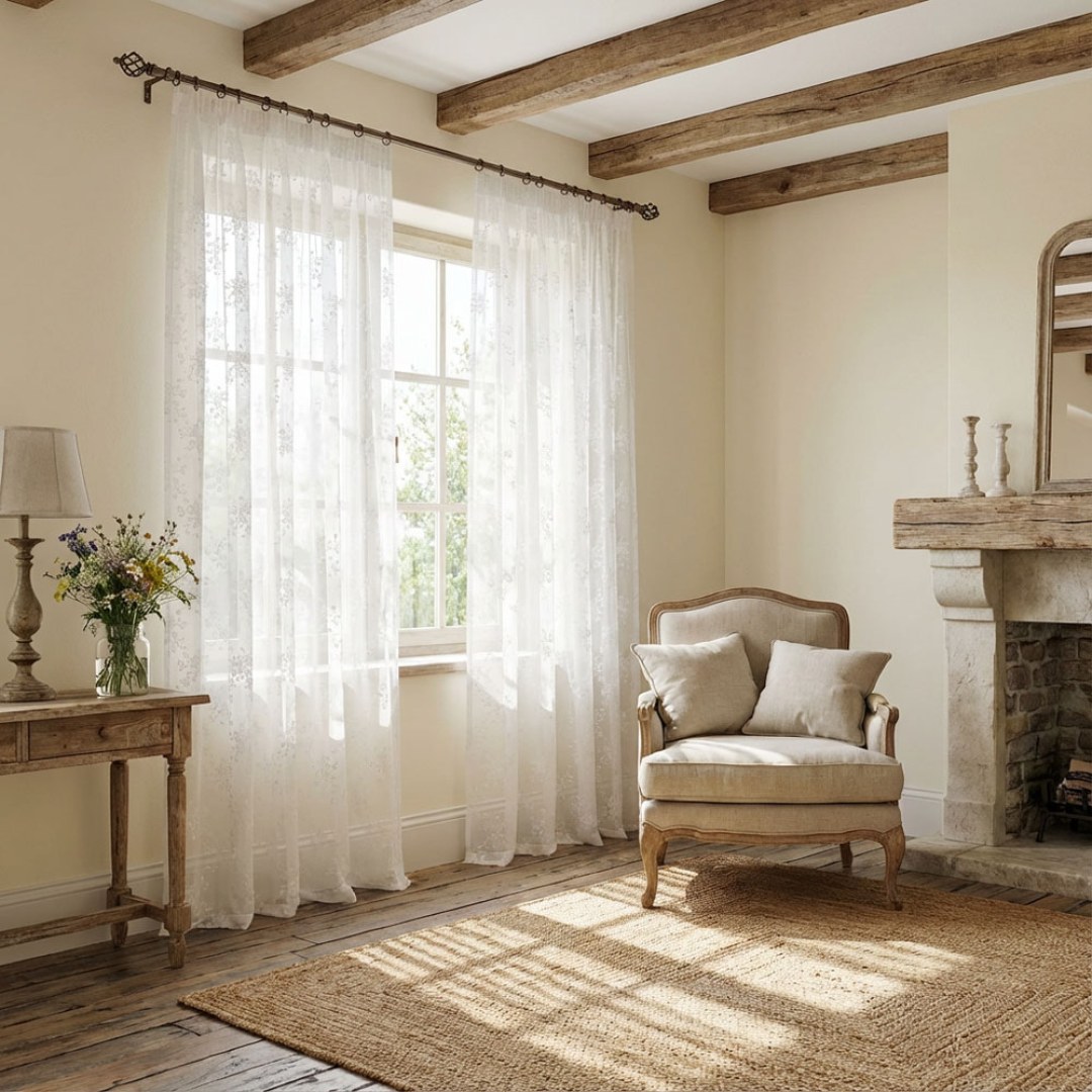 A delicate voile curtain featuring intricate floral embroidery. Its lightweight, airy fabric adds softness and charm, making it ideal for country and farmhouse interiors, while its neutral palette allows it to blend gracefully with contemporary settings.