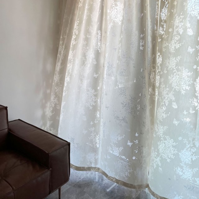 Enchanted Garden Rose & Butterfly Floral Cream Voile Curtain