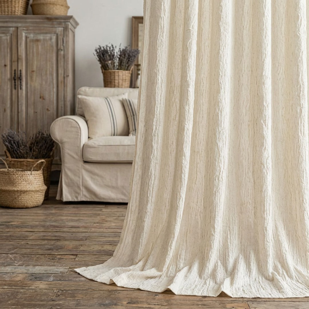 Crushed Drift features a naturally wrinkled linen texture that softens incoming light, creating a warm, airy atmosphere. Its gentle draped movement and organic surface pattern add quiet elegance to any space, pairing beautifully with country, farmhouse, and zen interiors.
